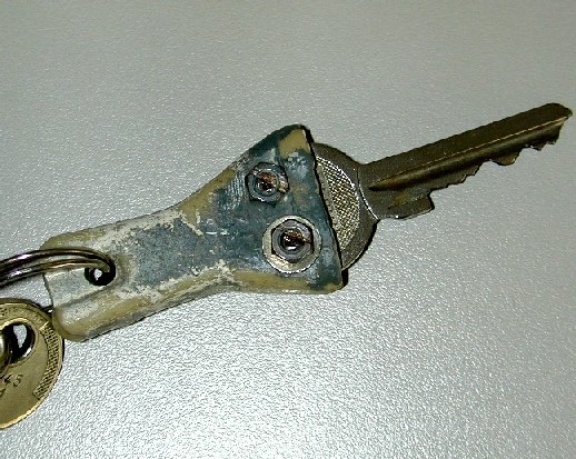 Um einen Schlüssel besser greifen zu können, wurde der Griff etwas verlängert. Dazu nimmt man ein kleines Stück Holz oder Metallblech. In das Holz bzw. Blech sägt man eine kleine Nut (Schlitz). In diese Nut steckt man den Schlüssel. An der Stelle, an der sich die Bohrung im Schlüsselgriff befindet, wird ein Loch durch das Holz / Blech gebohrt und der Schlüssel mit einer Schraube festgemacht. Inzwischen wurde uns auch ein Schlüsselhalter gezeigt, der mit Plexiglas statt Holz / Blech aufgebaut wurde. Das schaut professioneller aus.