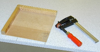 Dünnes Sperrholz mit 2 Kanten als Anschlag als Kuvertierhilfe mit Schraubzwinge