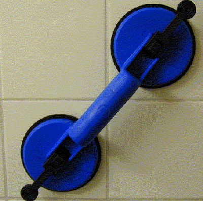 Der hier abgebildete Doppelsaugheber ist eine flexible Hilfe, wenn eine Griffmöglichkeit fehlt. Der Doppelsaugheber kann an jeder glatten Oberfläche fixiert werden, z. B. auf Fließen oder an einer Glasscheibe. In der Erprobungsphase wurde er oben im Türstock an der Oberseite fixiert und unsere Testperson mit 100 kg konnte sich daran hochziehen. Achtung, nicht unbedingt zur Nachahmung empfohlen.